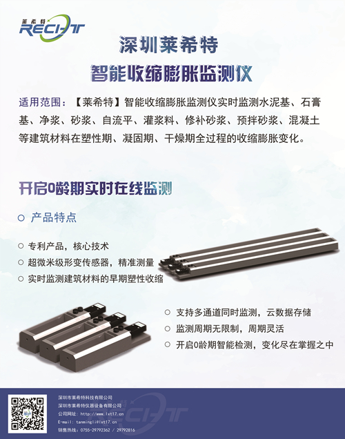 深圳莱希特智能收缩膨胀监测仪主要用于在线监测水泥基、石膏基、净浆、砂浆各龄期的收缩和膨胀率,开启0龄期实时在线监测。试验通过收缩槽另一端的形变传感器实时监测材料在凝固过程中的形变数据,采用物联网最新技术,手机和电脑端随时查看形变(收缩和膨胀)全过程。智能收缩膨胀监测仪广泛应用于自流平砂浆、修补砂浆、罐浆料、预拌砂浆、干混砂浆、新拌砂浆、混凝土、石膏、水泥、瓷砖胶等行业。