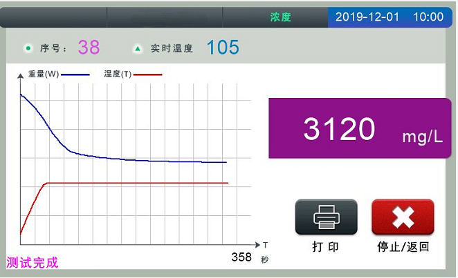 显示参数12种:水份%、固含量%、水份曲线、重量曲线、温度曲线;测试时长、恒重时间、测定模式、设定温度、测定温度、重量初值、重量终值